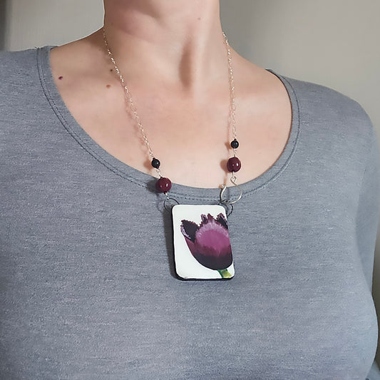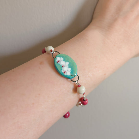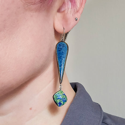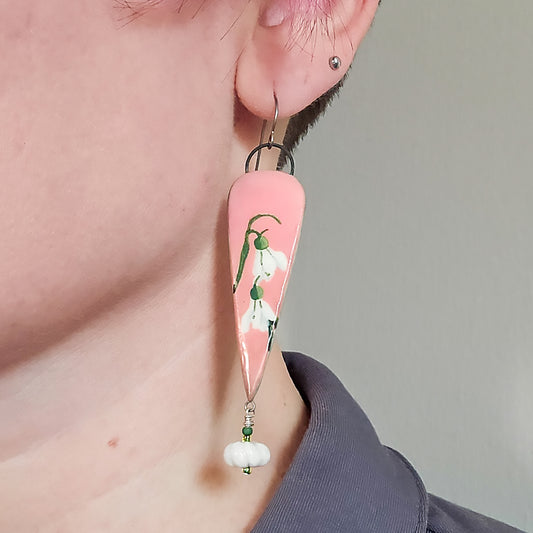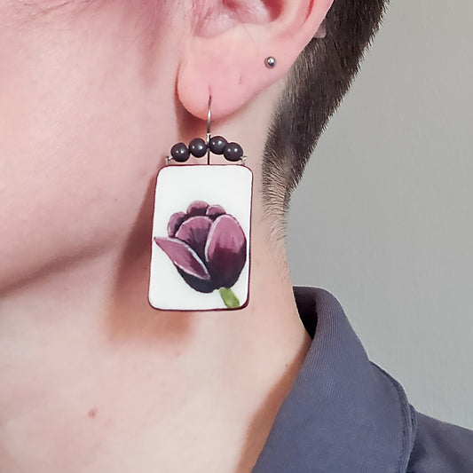 Each piece is lovingly created through a multi-step process. They are painted by hand with underglaze, often using a magnifying lamp to see the details I am creating. Pieces are fired in a kiln multiple times before bare surfaces are hand polished. At this point, they are combined with precious metals, as well as titanium ear wires and posts.